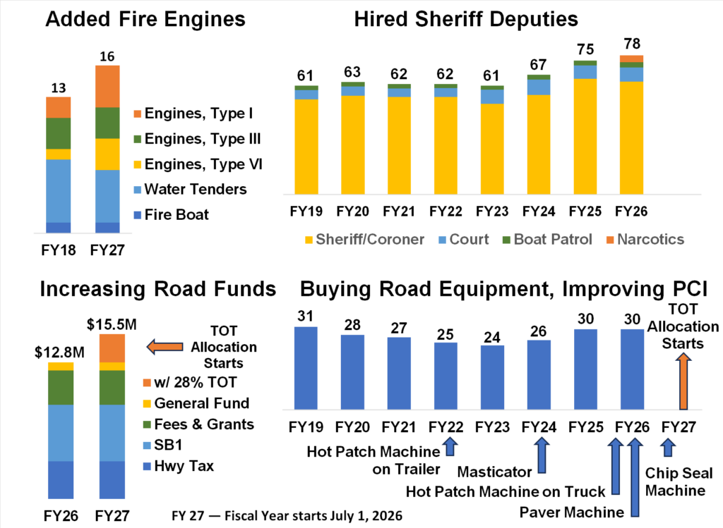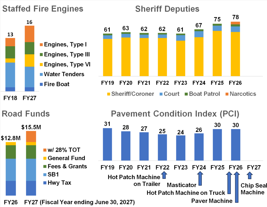 Real progress has been made. We made major improvements in forest health and fire safety, strengthening prevention, preparedness, and fire response. We doubled our fire stations. We have rebuilt and expanded law enforcement staffing to levels not seen in decades, improving public safety and response times across the county. And while our roads were once ranked among the worst in the State of California, we have reversed the trend — improving the Pavement Condition Index (PCI) and putting long-overdue investment back into our infrastructure.