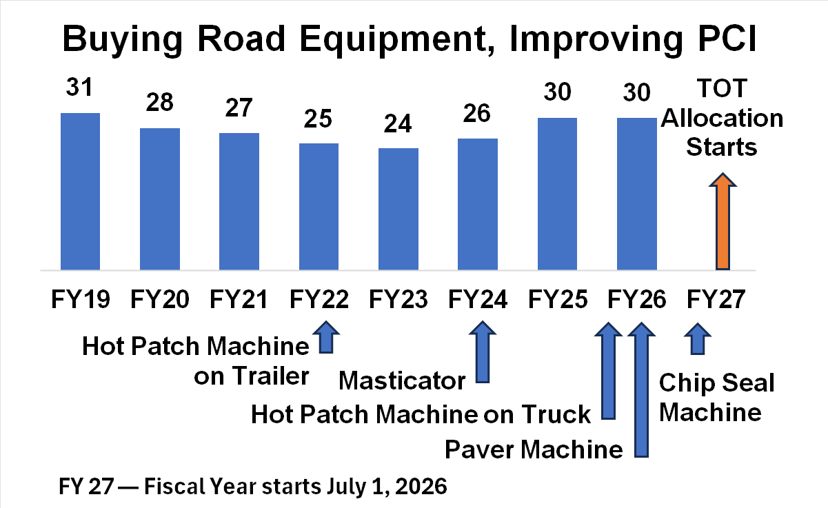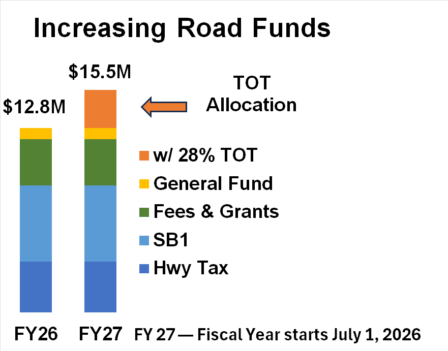 - In 2025, I proposed redirecting a portion of Transient Occupancy Tax (TOT) revenues to long-term road repair and scheduling. The Board agreed in principle and directed staff to implement this in the next budget cycle.