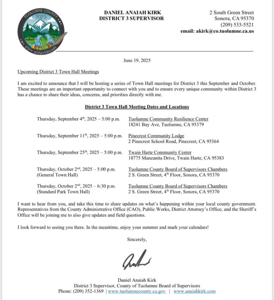 - No board update, simply a community update as far as bringing the temperature down here in Tuolumne County and not being so polarized and learning how to have conversations, potentially meet in the middle, and be a little kinder.